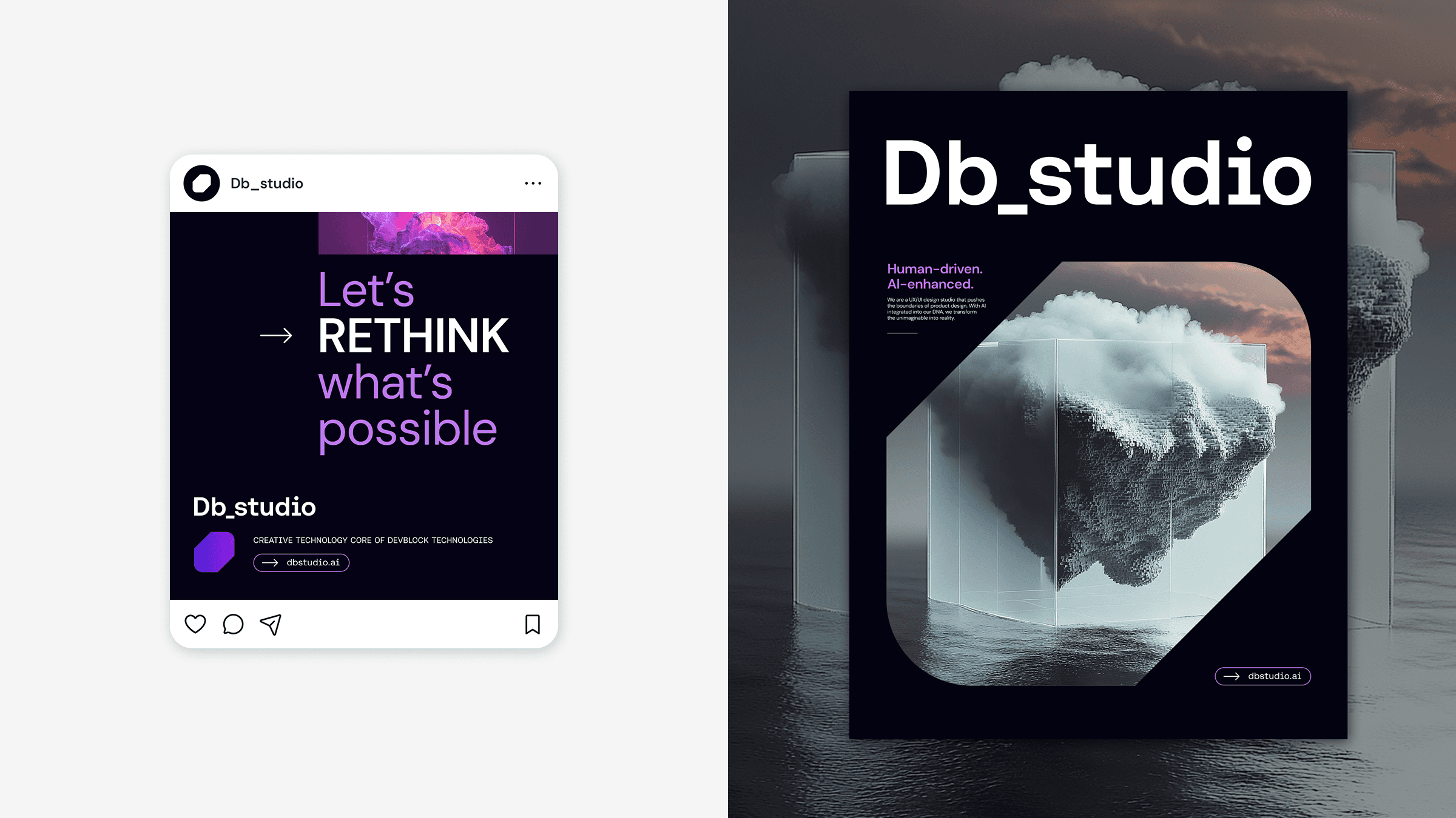 Db_studio is the creative identity of Devblock, a design-led branch created to showcase our craft, process, and philosophy. Our goal was to develop a brand that reflects our view of creativity: human at its core, enhanced by AI, while establishing a distinct presence within the larger Devblock ecosystem.